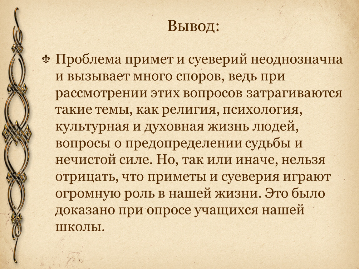 Проблема примет и суеверий неоднозначна и вызывает много споров, ведь при рассмотрении этих вопросов затрагиваются такие темы, как религия, психология, культурная и духовная жизнь людей, вопросы о предопределении судьбы и нечистой силе. Но, так или иначе, нельзя отрицать, что приметы и суеверия играют огромную роль в нашей жизни. Это было доказано при опросе учащихся нашей школы.