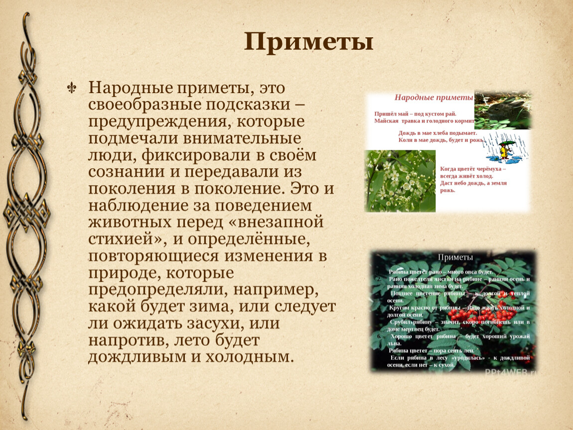 Народные приметы, это своеобразные подсказки – предупреждения, которые подмечали внимательные люди, фиксировали в своём сознании и передавали из поколения в поколение. Это и наблюдение за поведением животных перед «внезапной стихией», и определённые, повторяющиеся изменения в природе, которые предопределяли, например, какой будет зима, или следует ли ожидать засухи, или напротив, лето будет дождливым и холодным.