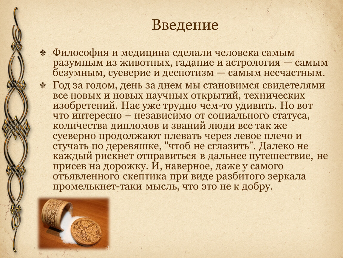 Год за годом, день за днем мы становимся свидетелями все новых и новых научных открытий, технических изобретений. Нас уже трудно чем-то удивить. Но вот что интересно – независимо от социального статуса, количества дипломов и званий люди все так же суеверно продолжают плевать через левое плечо и стучать по деревяшке, "чтоб не сглазить". Далеко не каждый рискнет отправиться в дальнее путешествие, не присев на дорожку. И, наверное, даже у самого отъявленного скептика при виде разбитого зеркала промелькнет-таки мысль, что это не к добру.
