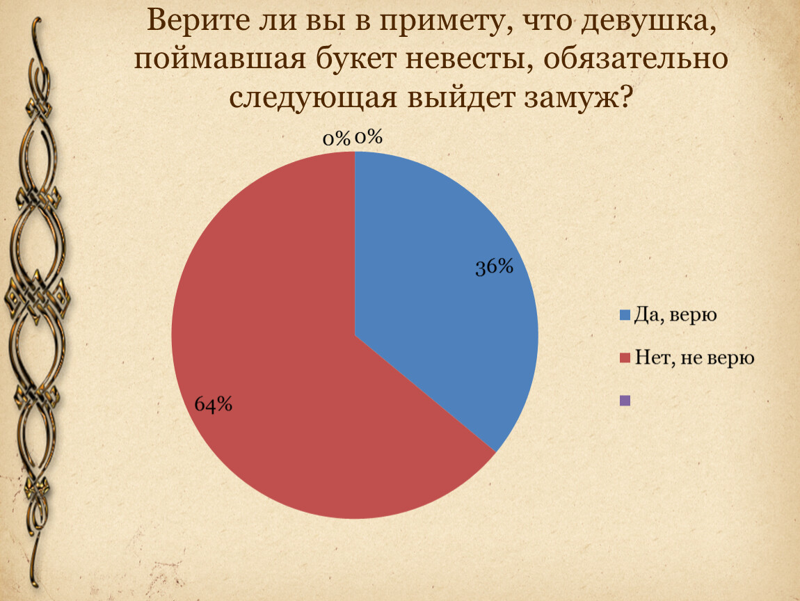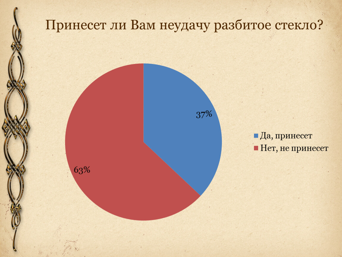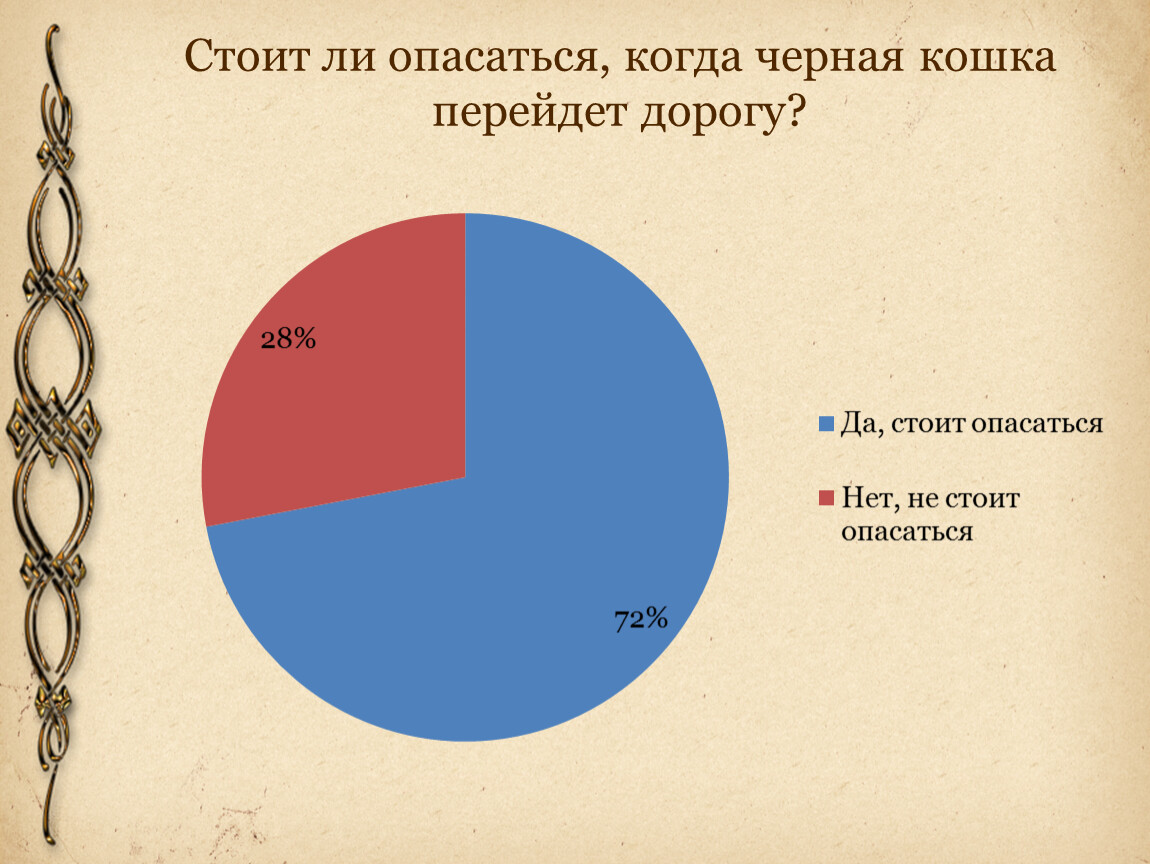 Что касается именно примет, то верят в то, что разбитое зеркало принесет несчастье 37 % учащихся, а не верят в эту примету 63 % учеников . Число 13 – несчастливым считают всего 34 % учащихся , причем в анкетировании многие ученики указали, что наоборот, число 13, они считают везучим, и оно у них вызывает хорошее настроение. Не верят в примету, что девушка, поймавшая букет невесты, обязательно следующая выйдет замуж, большинство опрошенных: 64% учеников. А вот в примету опасаться, когда черная кошка перейдет дорогу, ученики: 72% учеников опасается, когда кошка перебежит дорогу, а 28% нет.