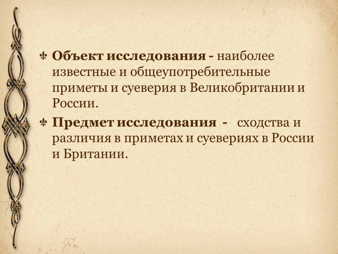 Объект исследования - наиболее известные и общеупотребительные приметы и суеверия в Великобритании и России.