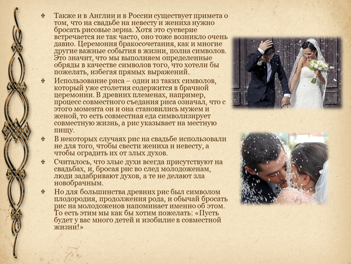 Также и в Англии и в России существует примета о том, что на свадьбе на невесту и жениха нужно бросать рисовые зерна. Хотя это суеверие встречается не так часто, оно тоже возникло очень давно. Церемония бракосочетания, как и многие другие важные события в жизни, полна символов. Это значит, что мы выполняем определенные обряды в качестве символов того, что хотели бы пожелать, избегая прямых выражений.
