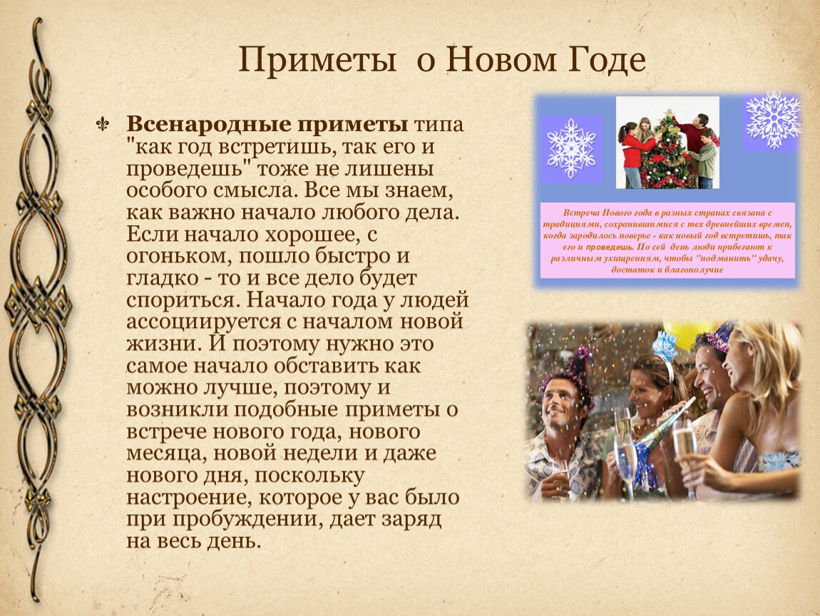 Всенародные приметы типа "как год встретишь, так его и проведешь" тоже не лишены особого смысла. Все мы знаем, как важно начало любого дела. Если начало хорошее, с огоньком, пошло быстро и гладко - то и все дело будет спориться. Начало года у людей ассоциируется с началом новой жизни. И поэтому нужно это самое начало обставить как можно лучше, поэтому и возникли подобные приметы о встрече нового года, нового месяца, новой недели и даже нового дня, поскольку настроение, которое у вас было при пробуждении, дает заряд на весь день.