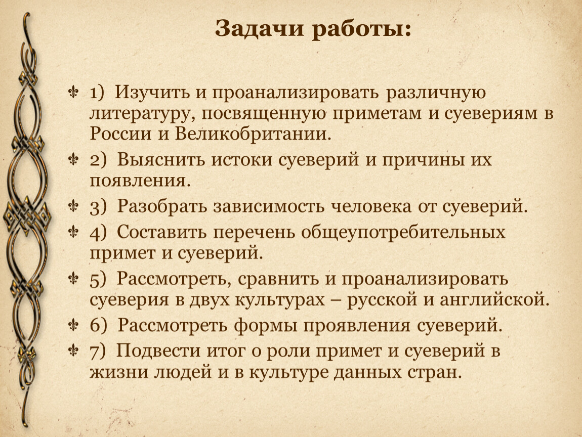 1) Изучить и проанализировать различную литературу, посвященную приметам и суевериям в России и Великобритании.