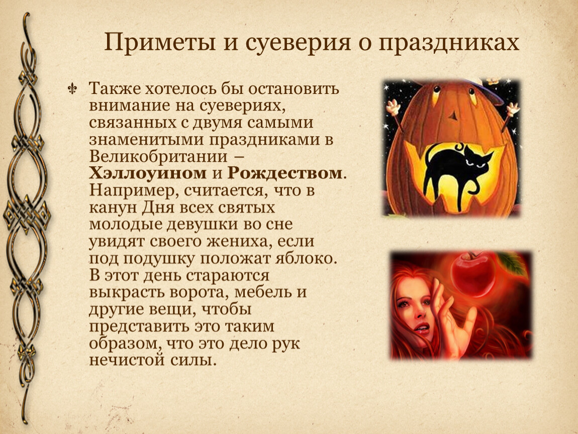 Также хотелось бы остановить внимание на суевериях, связанных с двумя самыми знаменитыми праздниками в Великобритании – Хэллоуином и Рождеством. Например, считается, что в канун Дня всех святых молодые девушки во сне увидят своего жениха, если под подушку положат яблоко. В этот день стараются выкрасть ворота, мебель и другие вещи, чтобы представить это таким образом, что это дело рук нечистой силы.
