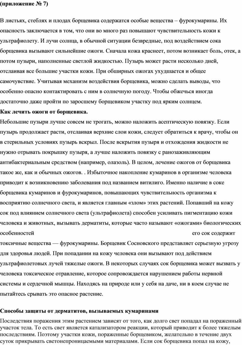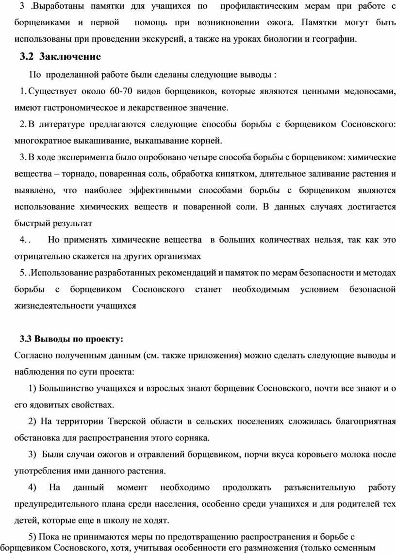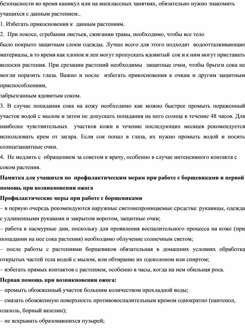 3 .Выработаны памятки для учащихся по профилактическим мерам при работе с борщевиками и первой помощь при возникновении ожога. Памятки могут быть использованы при проведении экскурсий, а также на уроках биологии и географии.