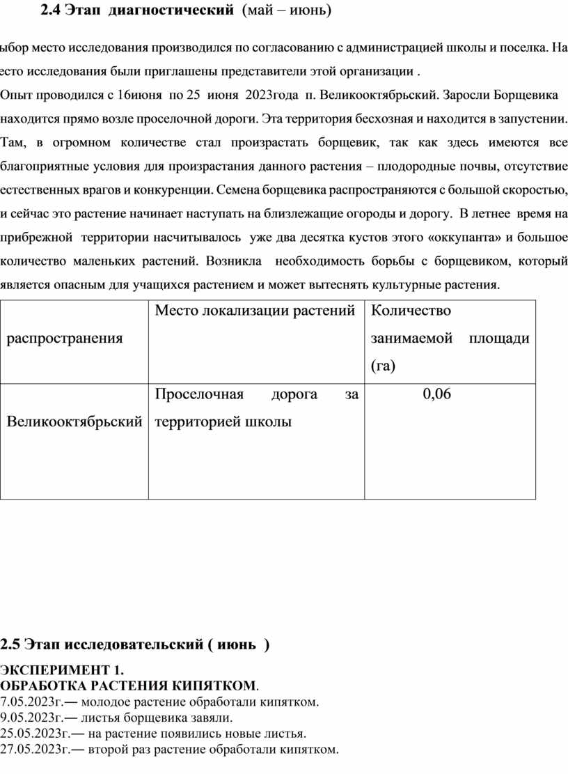 Объект исследования: «Борщевик Сосновского» на территории пгт. Великооктябрьский Этапы исследования.