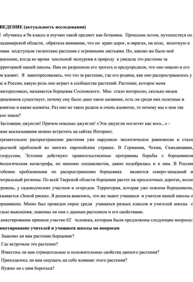 Стремительное распространение растения уже нарушило экологическое равновесие и стало серьезной проблемой во многих европейских странах. В Германии, Чехии, Скандинавии, Белоруссии, Эстонии действуют правительственные программы борьбы с борщевиком .Экологическая катастрофа, по мнению специалистов, давно подобралась и к нам. В России особенно проблемными по распространению борщевика являются северо-западный и центральный регионы. По всей Тверской области борщевик растет на проселочных дорогах, возле деревень, у садоводческих участков и огородов. Территория, которая уже освоена борщевиком, называется «Зоной риска». Я решила выяснить, что же знают учащиеся и учителя нашей школы о борщивиеке. Мною был проведен опрос среди учащихся разных классов и учителей школы с целью выяснения, знакомы ли они с данным растением и его свойствами.