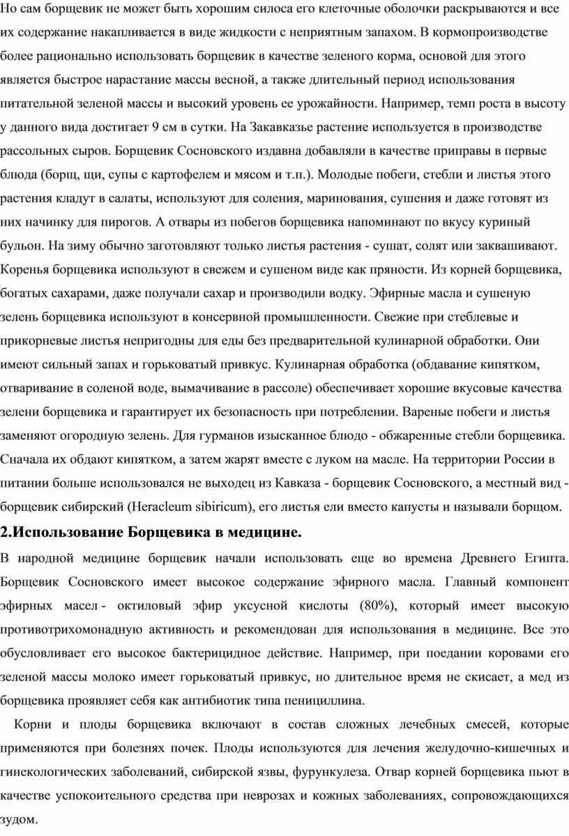 1. Существует около 60-70 видов борщевиков, которые являются ценными медоносами, имеют гастрономическое и лекарственное значение.