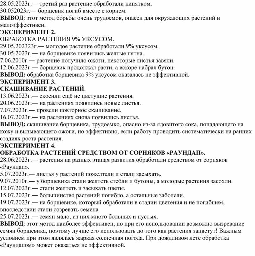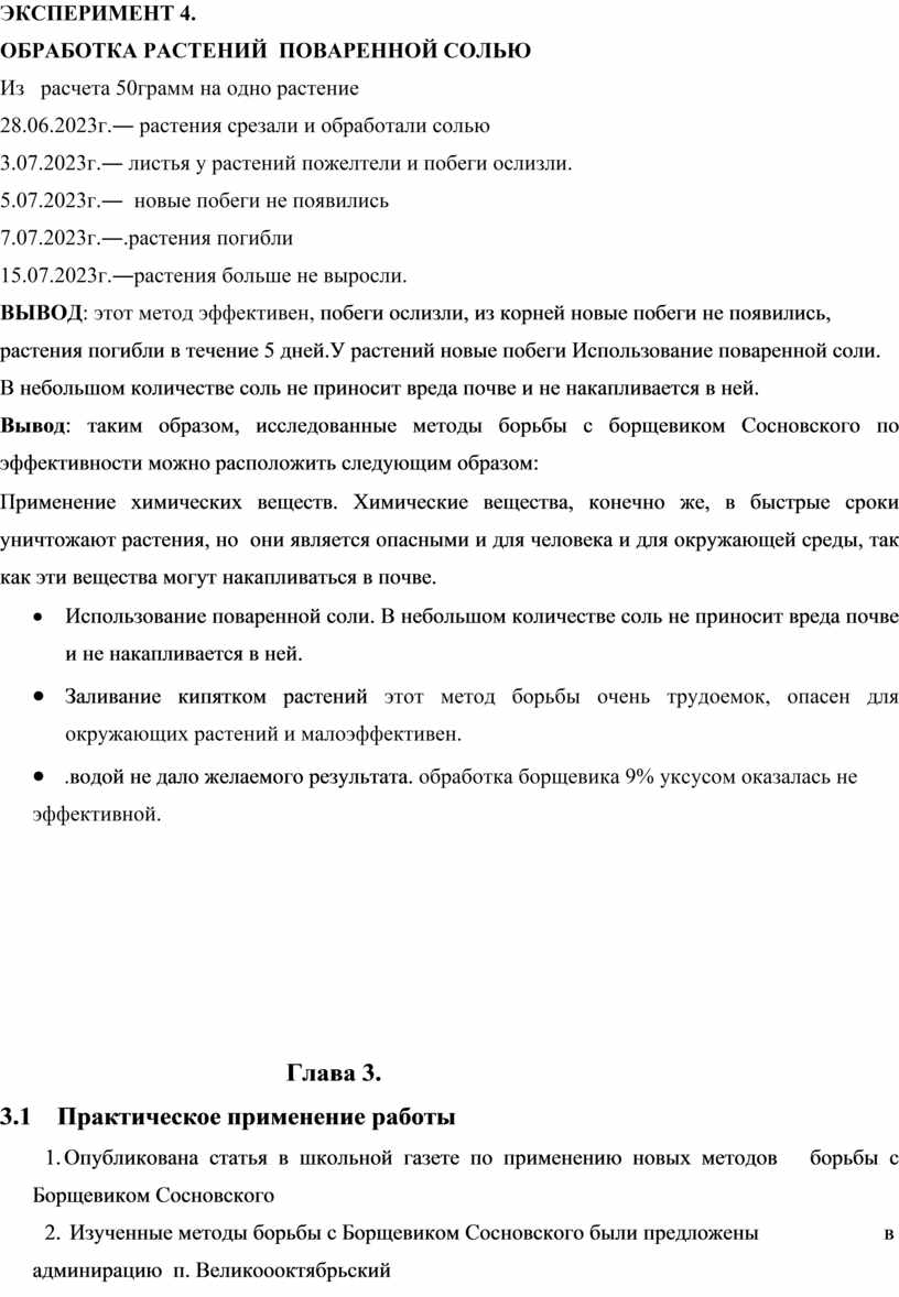 3. В ходе эксперимента было опробовано четыре способа борьбы с борщевиком: химические вещества – торнадо, поваренная соль, обработка кипятком, длительное заливание растения и выявлено, что наиболее эффективными способами борьбы с борщевиком являются использование химических веществ и поваренной соли. В данных случаях достигается быстрый результат