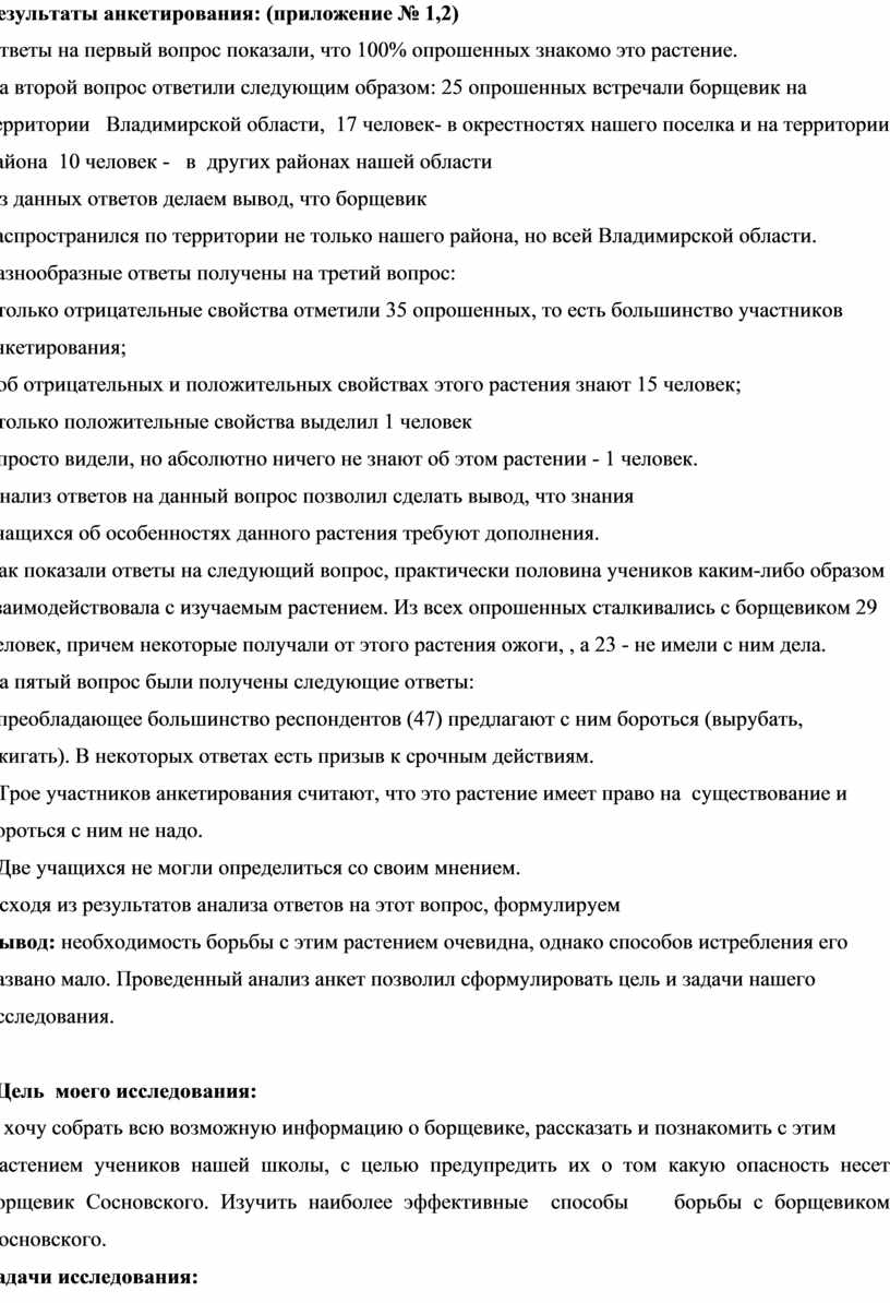 Вывод: необходимость борьбы с этим растением очевидна, однако способов истребления его названо мало. Проведенный анализ анкет позволил сформулировать цель и задачи нашего исследования.