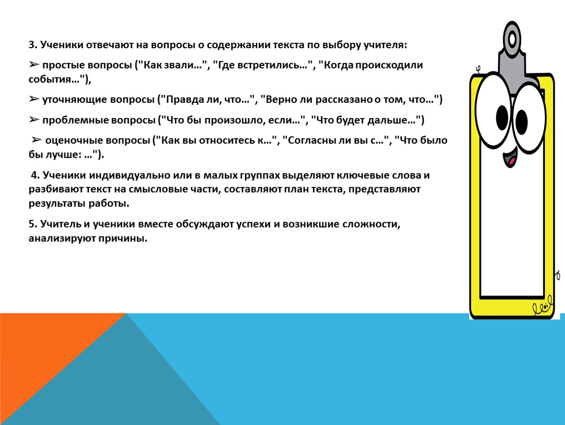 6. Ученики дочитывают второй фрагмент текста и отвечают на вопросы по выбору учителя о содержании прочитанных текстовых фрагментов (простые, уточняющие, проблемные или оценочные вопросы), формулируют позицию автора текста.