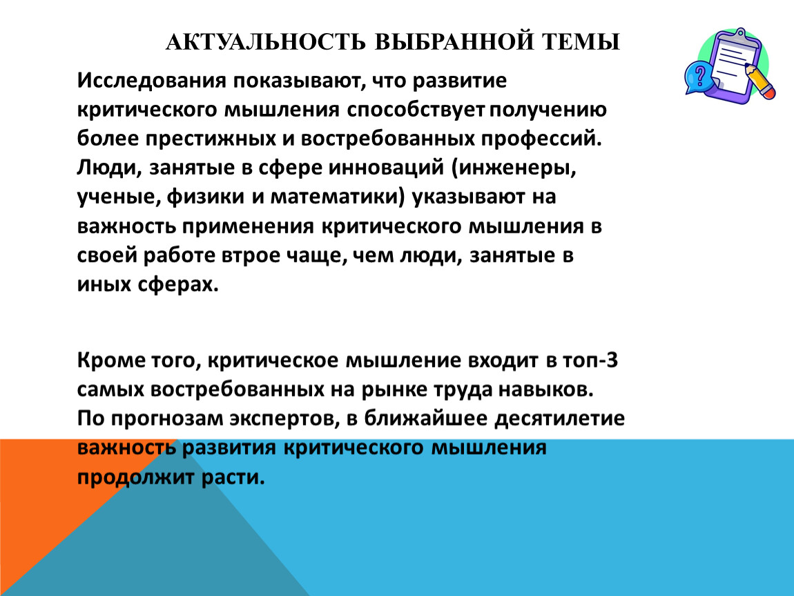 Кроме того, критическое мышление входит в топ-3 самых востребованных на рынке труда навыков. По прогнозам экспертов, в ближайшее десятилетие важность развития критического мышления продолжит расти.