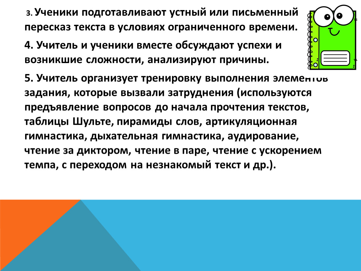 5. Учитель организует тренировку выполнения элементов задания, которые вызвали затруднения (используются предъявление вопросов до начала прочтения текстов, таблицы Шульте, пирамиды слов, артикуляционная гимнастика, дыхательная гимнастика, аудирование, чтение за диктором, чтение в паре, чтение с ускорением темпа, с переходом на незнакомый текст и др.).