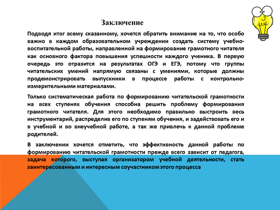 Подводя итог всему сказанному, хочется обратить внимание на то, что особо важно в каждом образовательном учреждении создать систему учебно-воспитательной работы, направленной на формирование грамотного читателя как основного фактора повышения успешности каждого ученика. В первую очередь это отразится на результатах ОГЭ и ЕГЭ, потому что группы читательских умений напрямую связаны с умениями, которые должны продемонстрировать выпускники в процессе работы с контрольно-измерительными материалами.