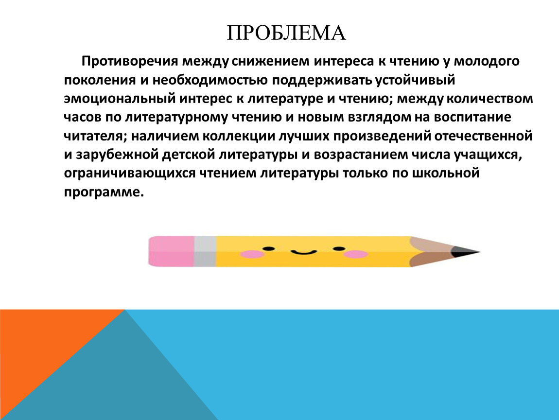 Противоречия между снижением интереса к чтению у молодого поколения и необходимостью поддерживать устойчивый эмоциональный интерес к литературе и чтению; между количеством часов по литературному чтению и новым взглядом на воспитание читателя; наличием коллекции лучших произведений отечественной и зарубежной детской литературы и возрастанием числа учащихся, ограничивающихся чтением литературы только по школьной программе.