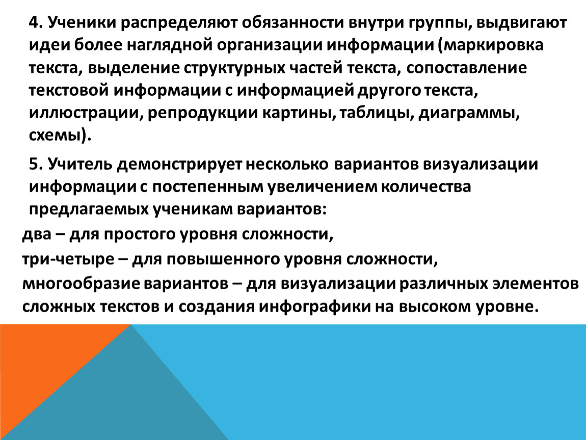 4. Ученики распределяют обязанности внутри группы, выдвигают идеи более наглядной организации информации (маркировка текста, выделение структурных частей текста, сопоставление текстовой информации с информацией другого текста, иллюстрации, репродукции картины, таблицы, диаграммы, схемы).