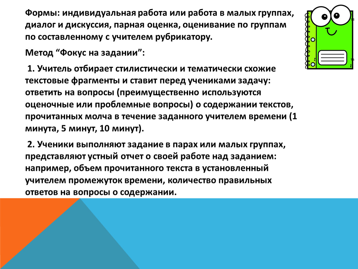 2. Ученики выполняют задание в парах или малых группах, представляют устный отчет о своей работе над заданием: например, объем прочитанного текста в установленный учителем промежуток времени, количество правильных ответов на вопросы о содержании.