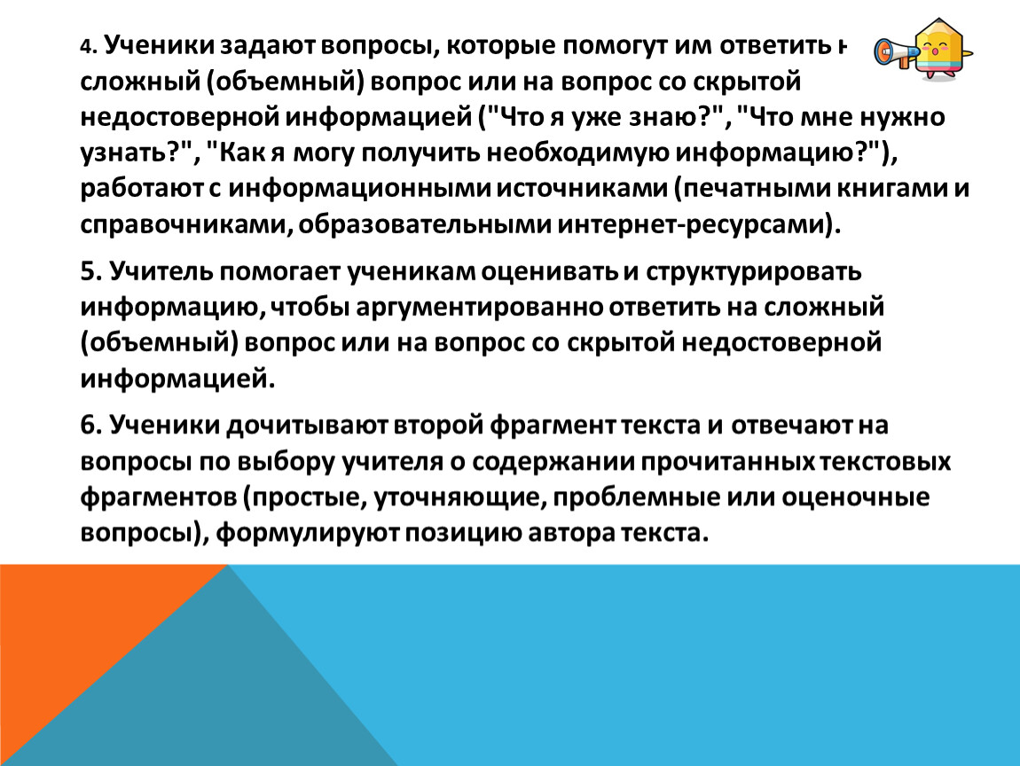 5. Учитель помогает ученикам оценивать и структурировать информацию, чтобы аргументированно ответить на сложный (объемный) вопрос или на вопрос со скрытой недостоверной информацией.