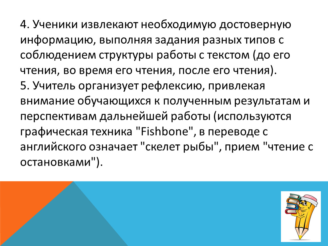 4. Ученики извлекают необходимую достоверную информацию, выполняя задания разных типов с соблюдением структуры работы с текстом (до его чтения, во время его чтения, после его чтения).