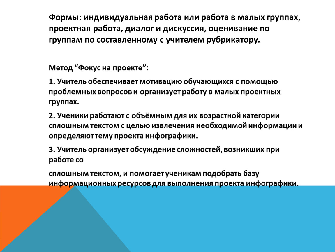 Формы: индивидуальная работа или работа в малых группах, проектная работа, диалог и дискуссия, оценивание по группам по составленному с учителем рубрикатору.
