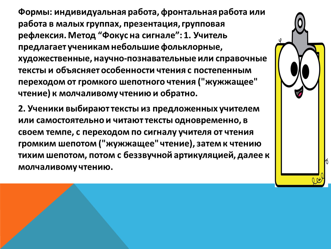 Формы: индивидуальная работа, фронтальная работа или работа в малых группах, презентация, групповая рефлексия. Метод “Фокус на сигнале”: 1. Учитель предлагает ученикам небольшие фольклорные, художественные, научно-познавательные или справочные тексты и объясняет особенности чтения с постепенным переходом от громкого шепотного чтения ("жужжащее" чтение) к молчаливому чтению и обратно.