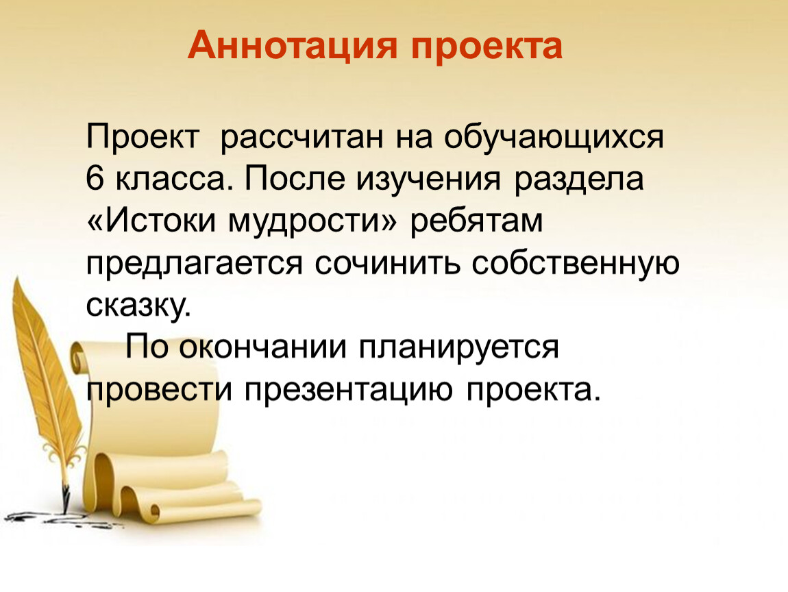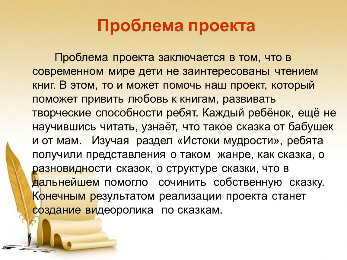 Проблема проекта заключается в том, что в современном мире дети не заинтересованы чтением книг. В этом, то и может помочь наш проект, который поможет привить любовь к книгам, развивать творческие способности ребят. Каждый ребёнок, ещё не научившись читать, узнаёт, что такое сказка от бабушек и от мам. Изучая раздел «Истоки мудрости», ребята получили представления о таком жанре, как сказка, о разновидности сказок, о структуре сказки, что в дальнейшем помогло сочинить собственную сказку. Конечным результатом реализации проекта станет создание видеоролика по сказкам.