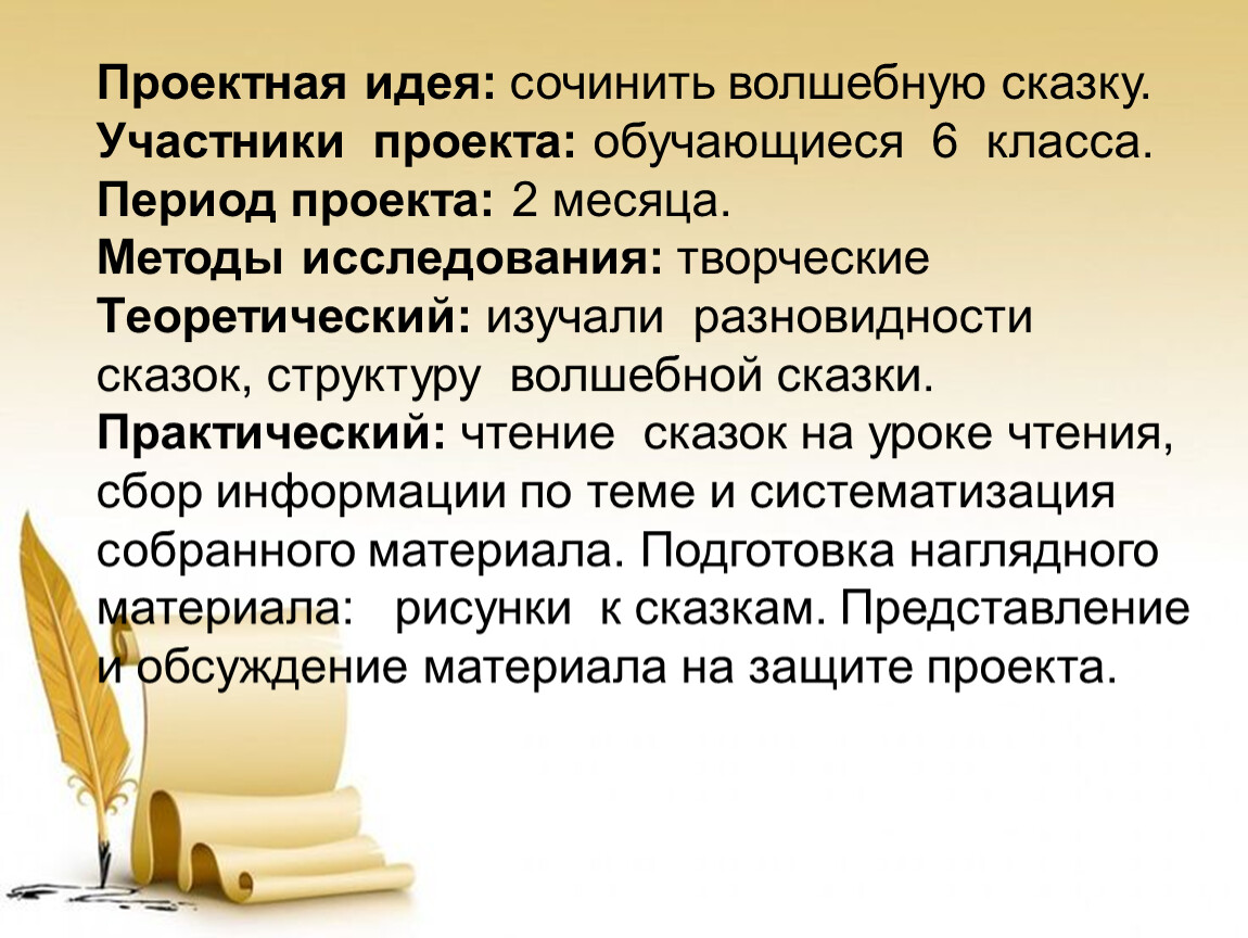 Практический: чтение сказок на уроке чтения, сбор информации по теме и систематизация собранного материала. Подготовка наглядного материала: рисунки к сказкам. Представление и обсуждение материала на защите проекта.