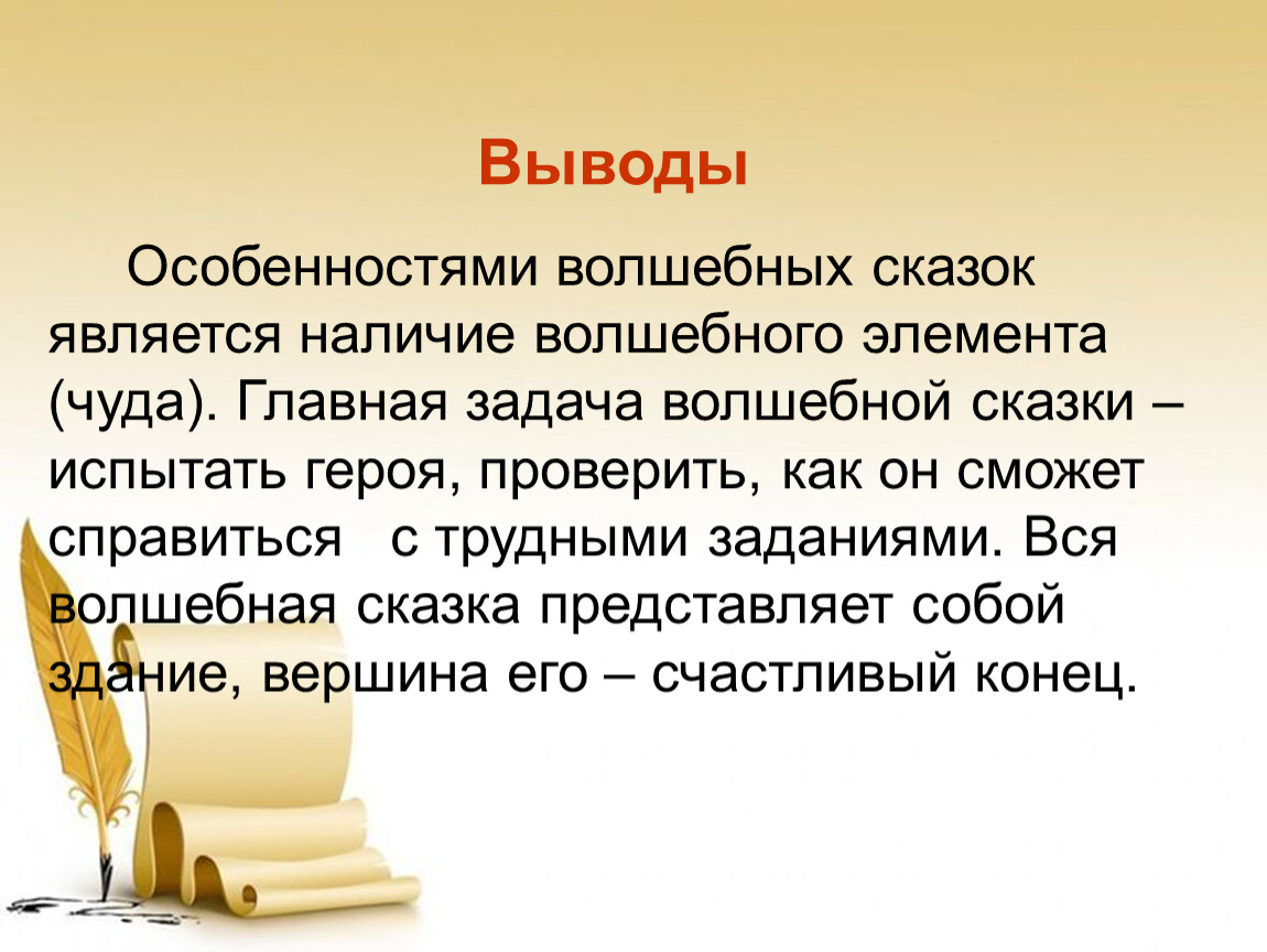 Особенностями волшебных сказок является наличие волшебного элемента (чуда). Главная задача волшебной сказки – испытать героя, проверить, как он сможет справиться с трудными заданиями. Вся волшебная сказка представляет собой здание, вершина его – счастливый конец.