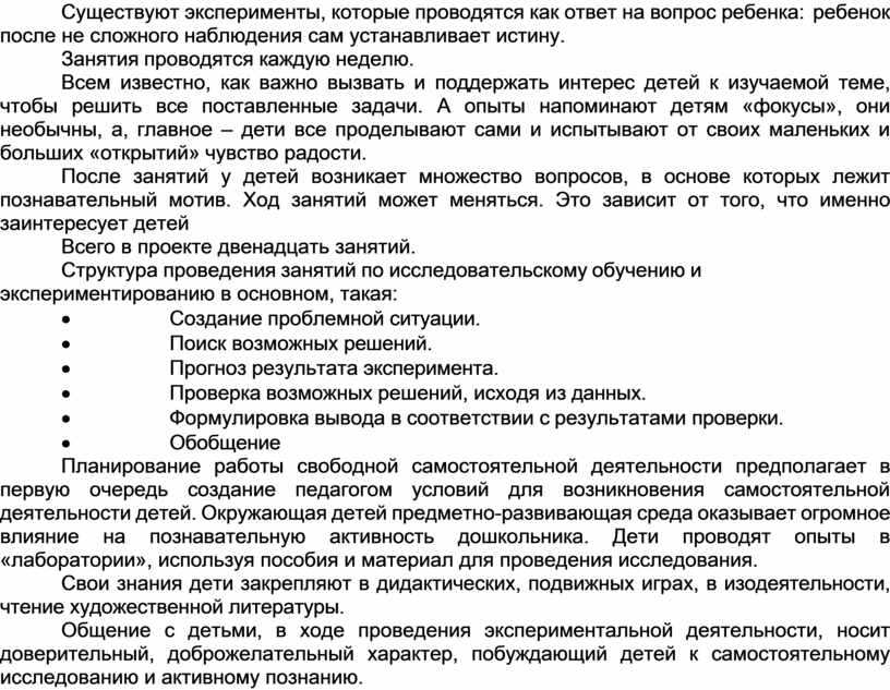 Структура проведения занятий по исследовательскому обучению и экспериментированию в основном, такая:
