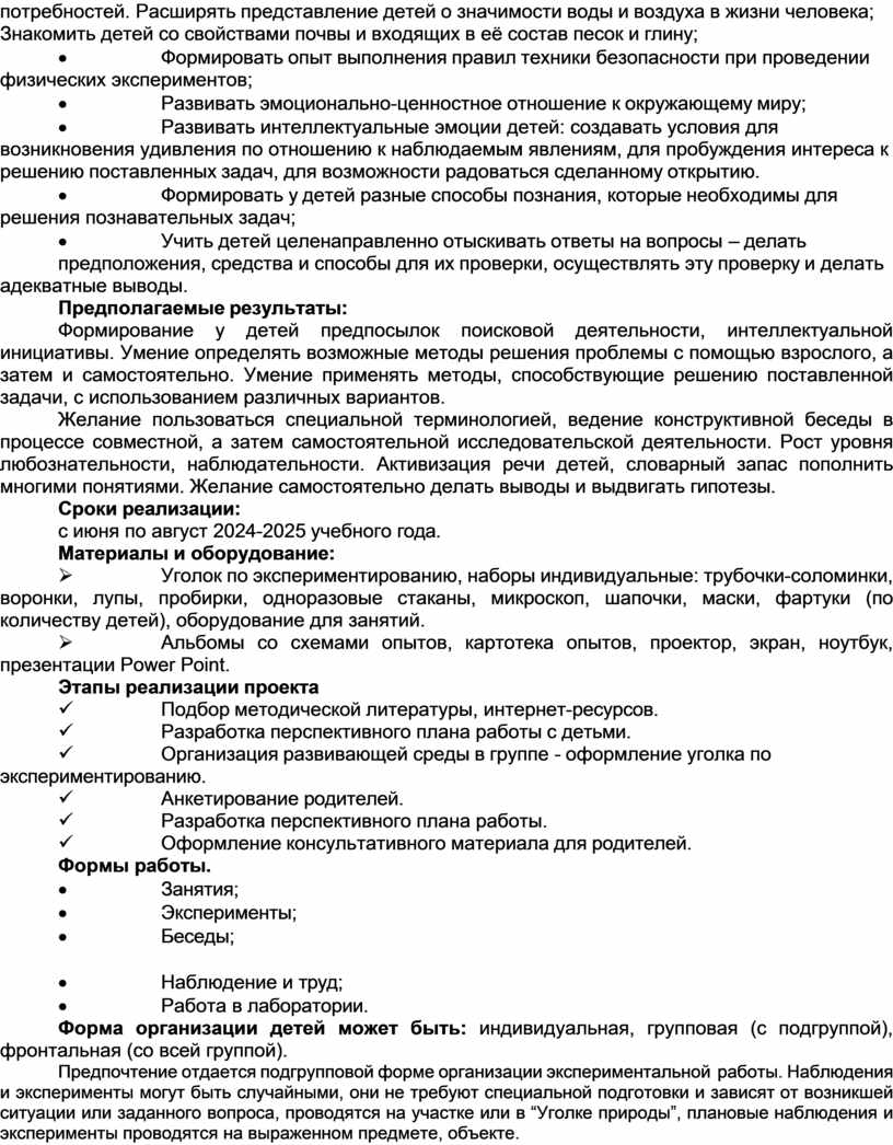 Предпочтение отдается подгрупповой форме организации экспериментальной работы. Наблюдения и эксперименты могут быть случайными, они не требуют специальной подготовки и зависят от возникшей ситуации или заданного вопроса, проводятся на участке или в “Уголке природы”, плановые наблюдения и эксперименты проводятся на выраженном предмете, объекте.