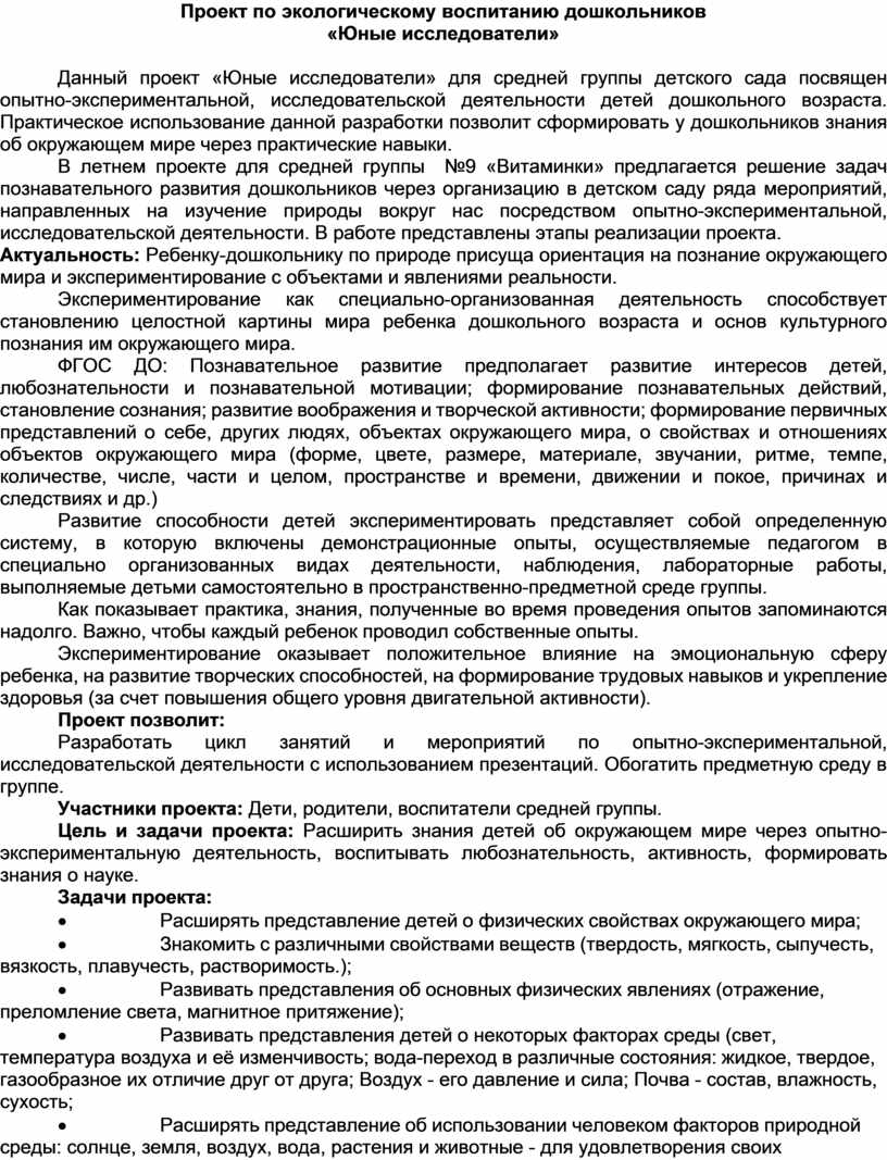 В летнем проекте для средней группы №9 «Витаминки» предлагается решение задач познавательного развития дошкольников через организацию в детском саду ряда мероприятий, направленных на изучение природы вокруг нас посредством опытно-экспериментальной, исследовательской деятельности. В работе представлены этапы реализации проекта.