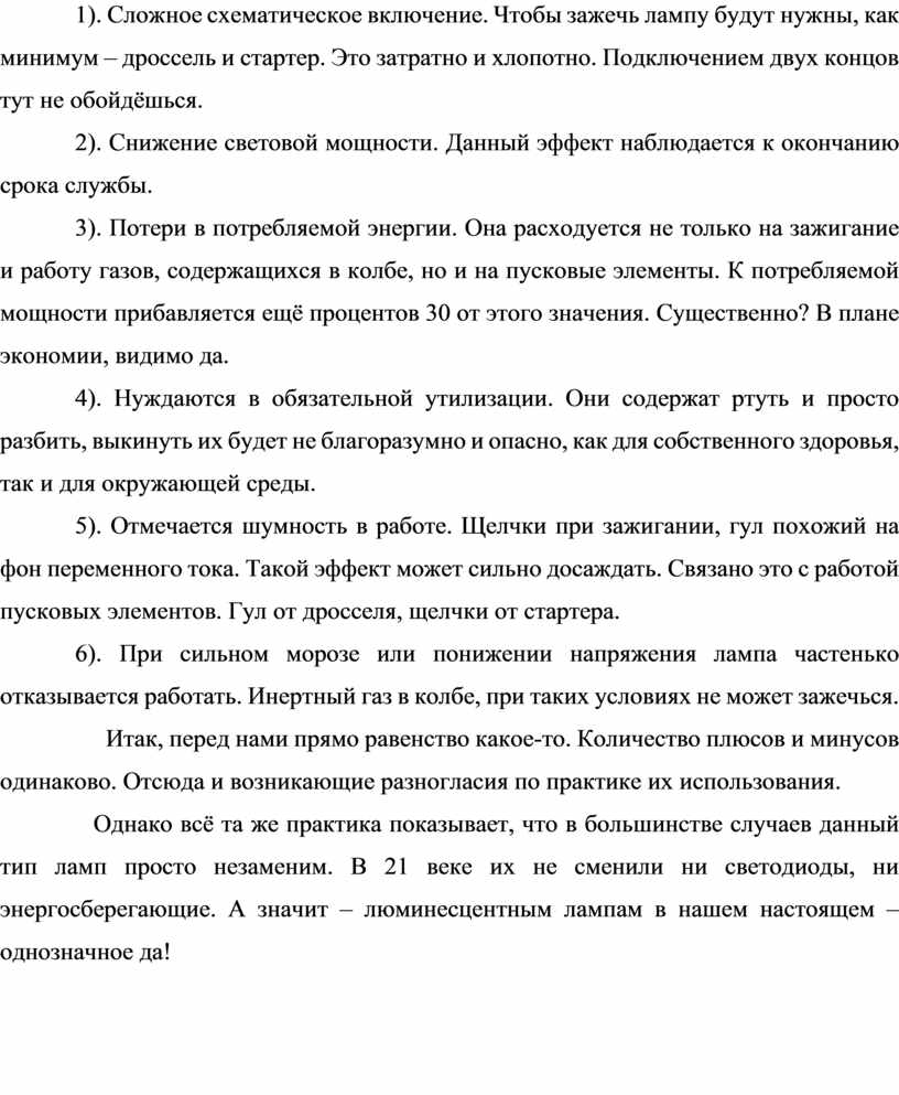 3). Потери в потребляемой энергии. Она расходуется не только на зажигание и работу газов, содержащихся в колбе, но и на пусковые элементы. К потребляемой мощности прибавляется ещё процентов 30 от этого значения. Существенно? В плане экономии, видимо да.