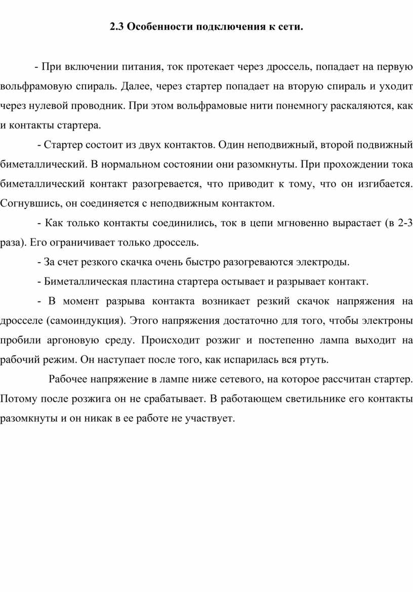 - При включении питания, ток протекает через дроссель, попадает на первую вольфрамовую спираль. Далее, через стартер попадает на вторую спираль и уходит через нулевой проводник. При этом вольфрамовые нити понемногу раскаляются, как и контакты стартера.