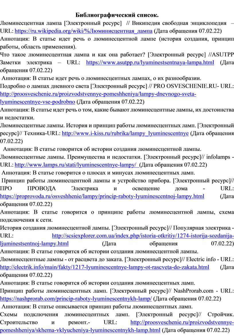 1. Люминесцентная лампа [Электронный ресурс] // Википедия свободная энциклопедия – URL: https://ru.wikipedia.org/wiki/%Люминисцентная_лампа (Дата обращения 07.02.22)