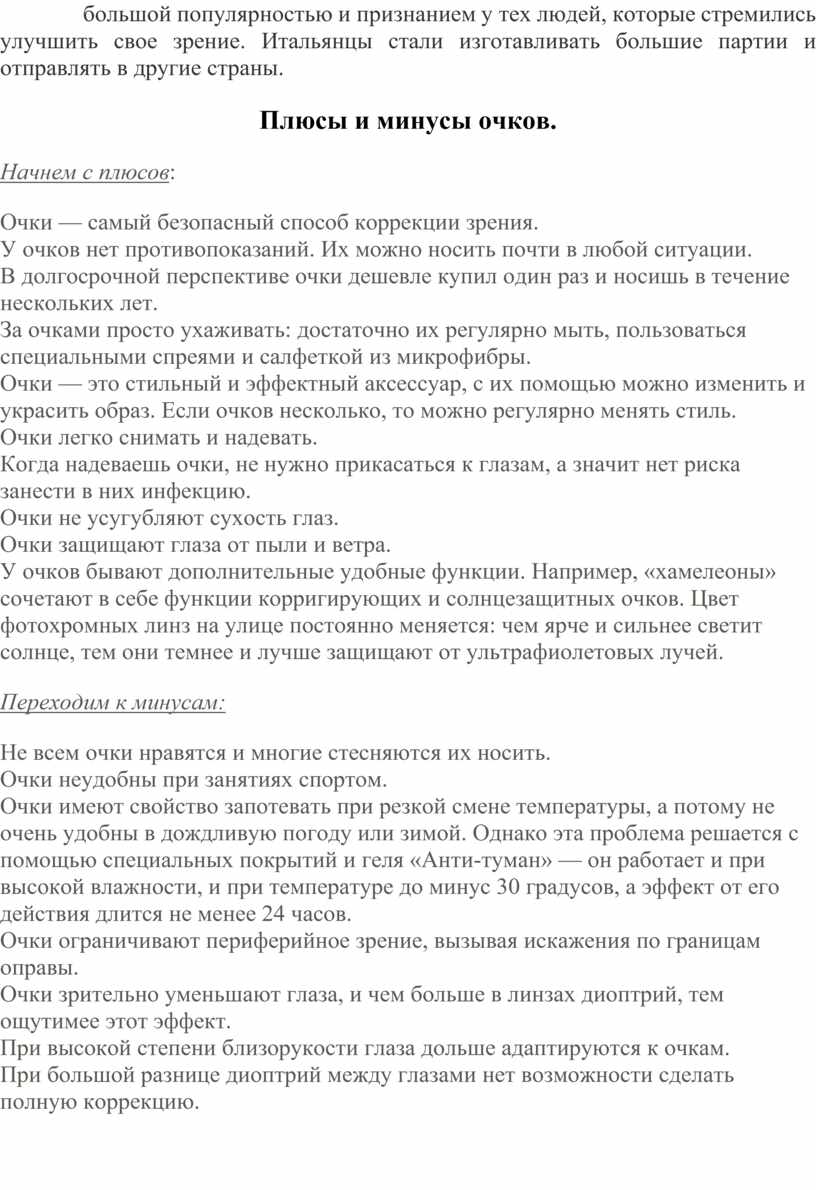 Плюсы и минусы очков.