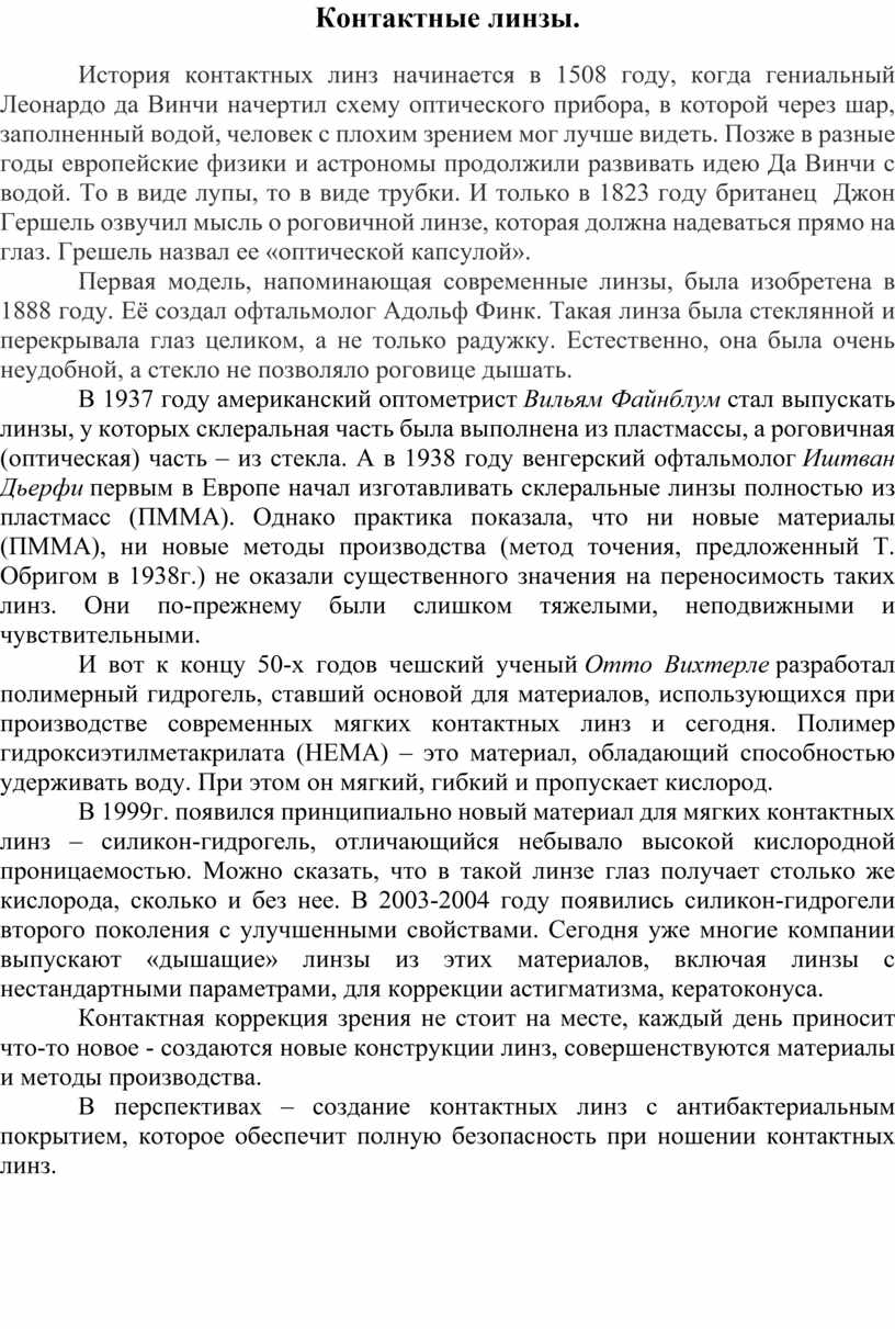 История контактных линз начинается в 1508 году, когда гениальный Леонардо да Винчи начертил схему оптического прибора, в которой через шар, заполненный водой, человек с плохим зрением мог лучше видеть. Позже в разные годы европейские физики и астрономы продолжили развивать идею Да Винчи с водой. То в виде лупы, то в виде трубки. И только в 1823 году британец Джон Гершель озвучил мысль о роговичной линзе, которая должна надеваться прямо на глаз. Грешель назвал ее «оптической капсулой».