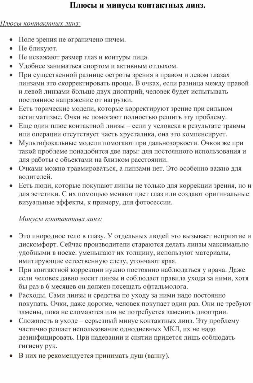 Плюсы и минусы контактных линз.