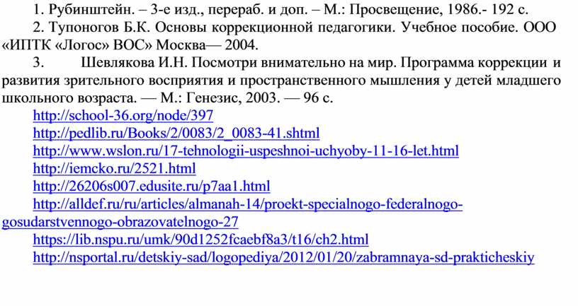 10. Шевлякова И.Н. Посмотри внимательно на мир. Программа коррекции и развития зрительного восприятия и пространственного мышления у детей младшего школьного возраста. — М.: Генезис, 2003. — 96 с.