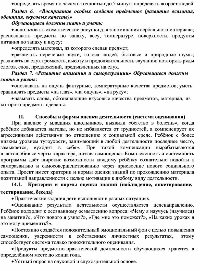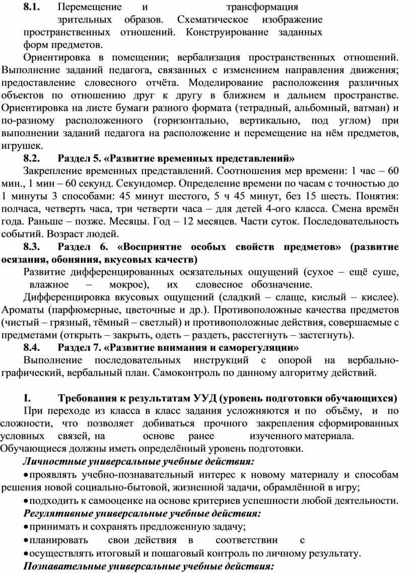 составляющих познавательной деятельности «особенного» ребёнка. Любая ситуация, задающая младшему школьнику проблему, побуждает его к поиску решения и требует мыслительных операций. Акцент при этом делается на формирование умений и навыков применения сенсорных эталонов, а не на факт дублирования или прохождения программного материала по разным общеобразовательным предметам.
