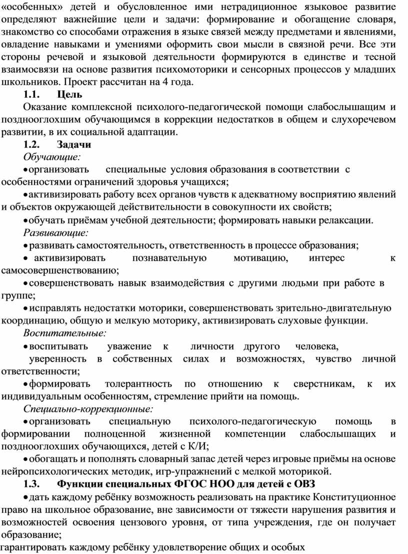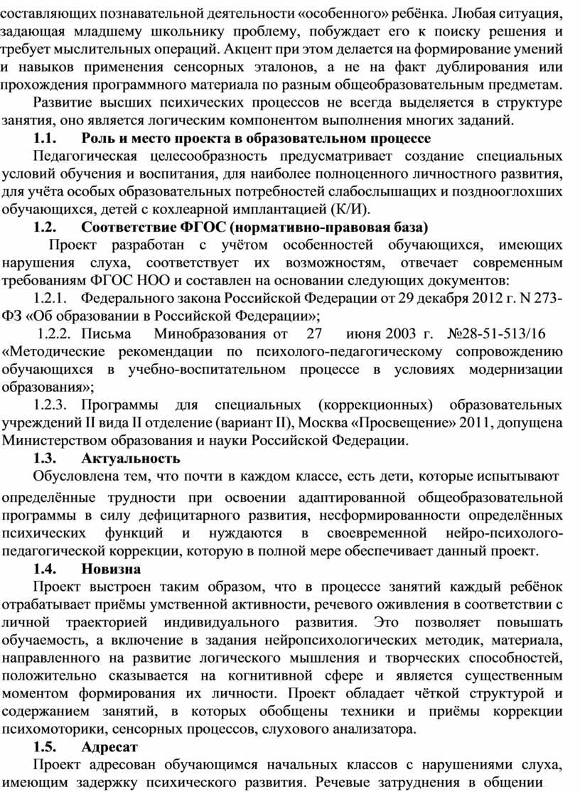 Проект разработан с учётом особенностей обучающихся, имеющих нарушения слуха, соответствует их возможностям, отвечает современным требованиям ФГОС НОО и составлен на основании следующих документов: