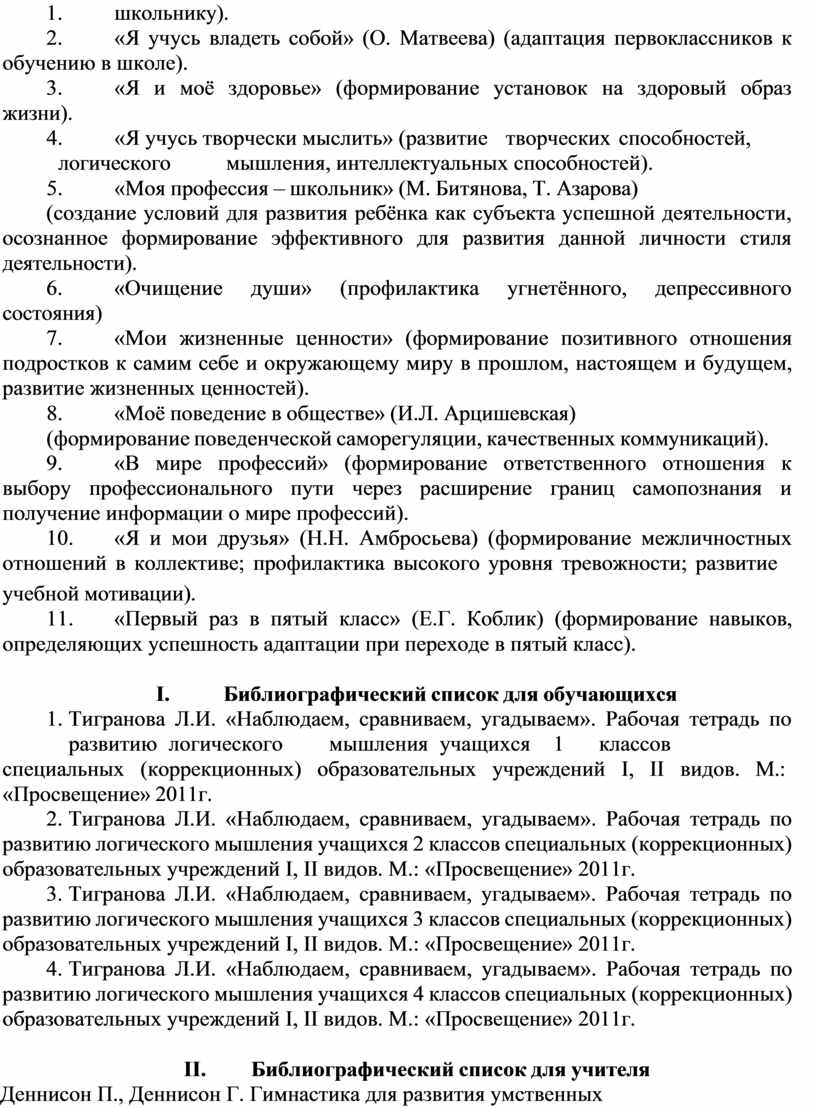 4. Тигранова Л.И. «Наблюдаем, сравниваем, угадываем». Рабочая тетрадь по развитию логического мышления учащихся 4 классов специальных (коррекционных) образовательных учреждений I, II видов. М.: «Просвещение» 2011г.