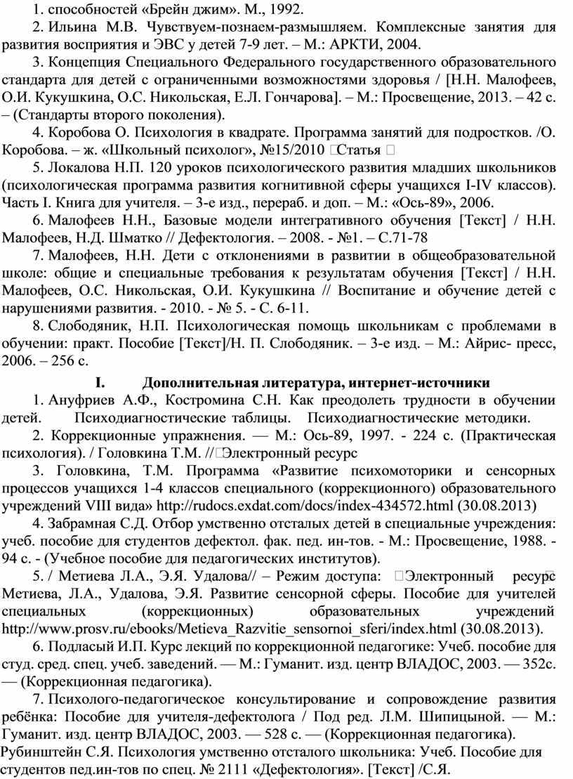 8. Рубинштейн С.Я. Психология умственно отсталого школьника: Учеб. Пособие для студентов пед.ин-тов по спец. № 2111 «Дефектология». [Текст] /С.Я. Рубинштейн. – 3-е изд., перераб. и доп. – М.: Просвещение, 1986.- 192 с.