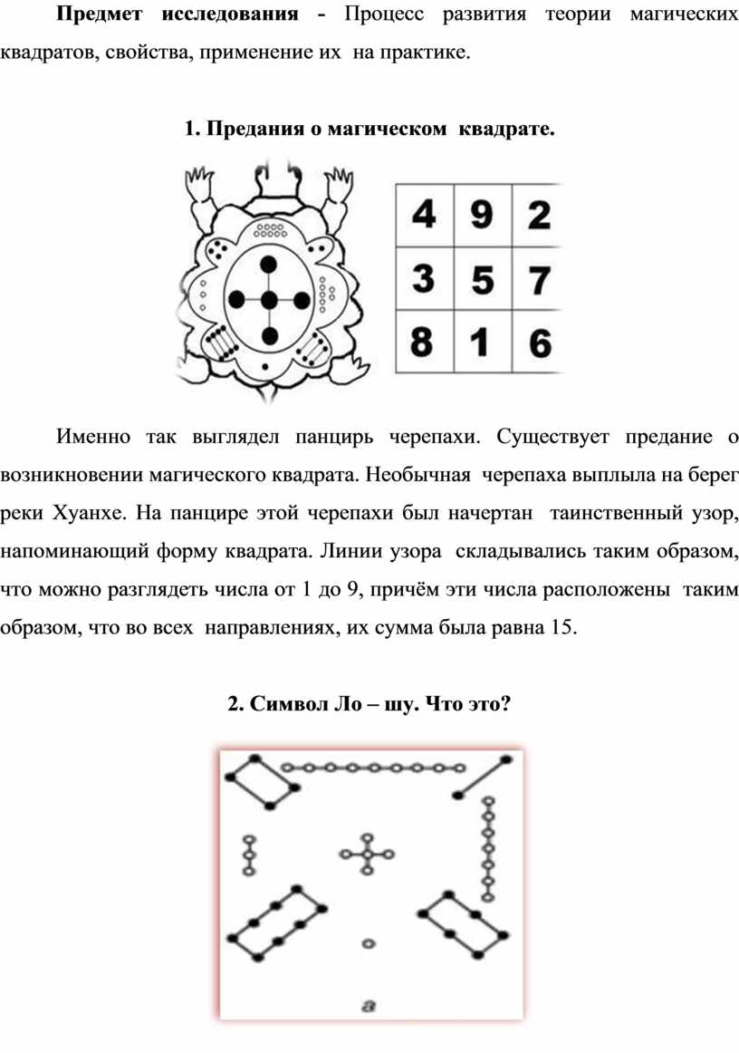 Предмет исследования - Процесс развития теории магических квадратов, свойства, применение их на практике.