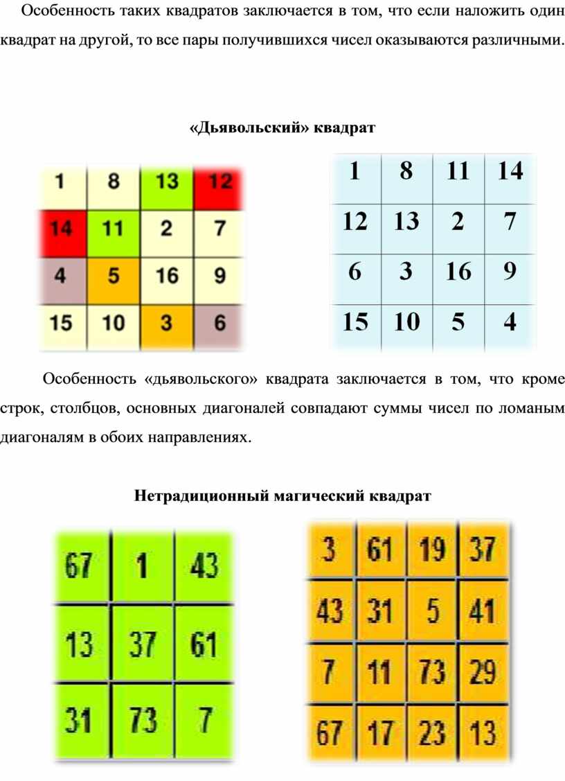Особенность таких квадратов заключается в том, что если наложить один квадрат на другой, то все пары получившихся чисел оказываются различными.