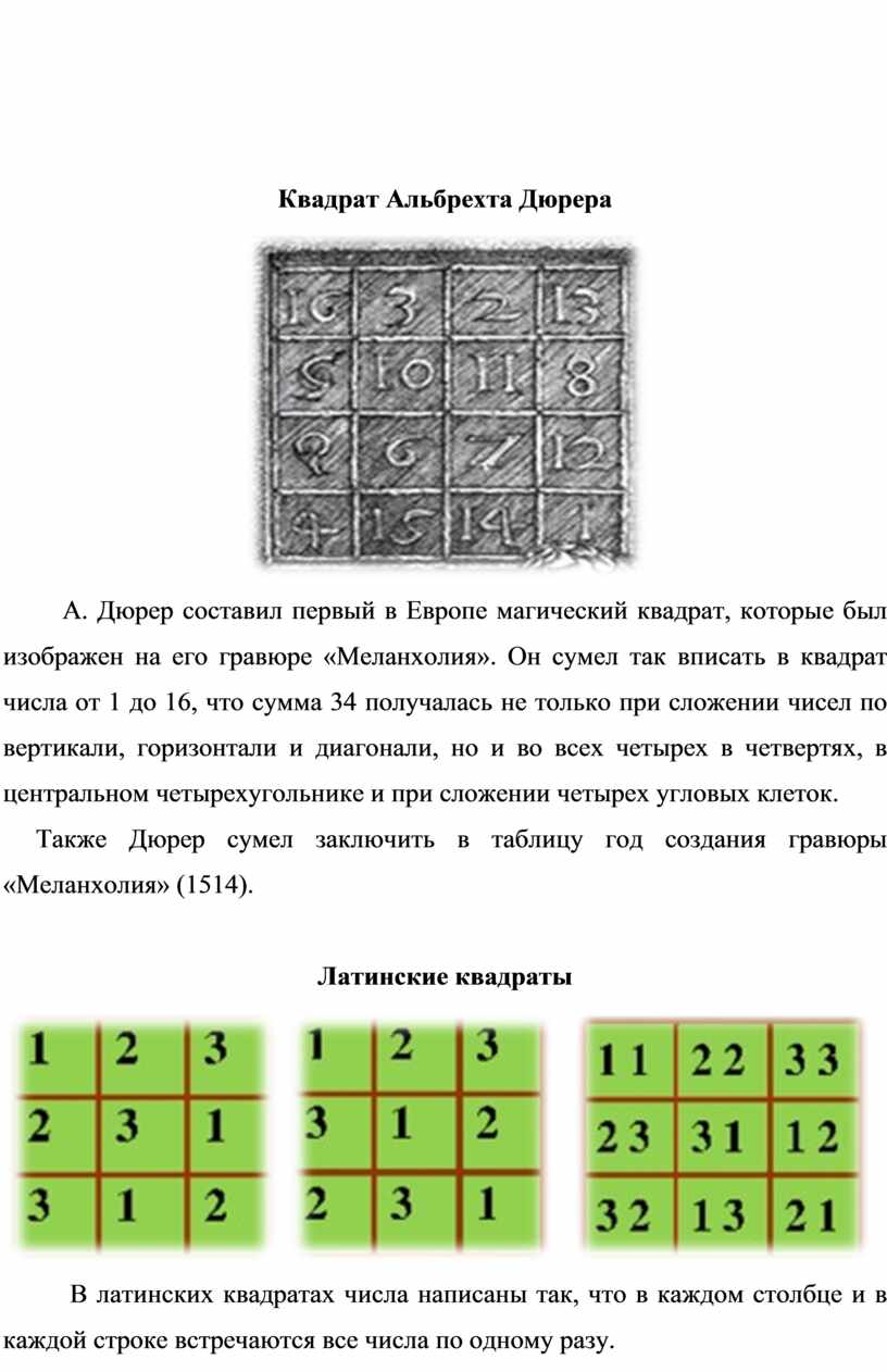 А. Дюрер составил первый в Европе магический квадрат, которые был изображен на его гравюре «Меланхолия». Он сумел так вписать в квадрат числа от 1 до 16, что сумма 34 получалась не только при сложении чисел по вертикали, горизонтали и диагонали, но и во всех четырех в четвертях, в центральном четырехугольнике и при сложении четырех угловых клеток.