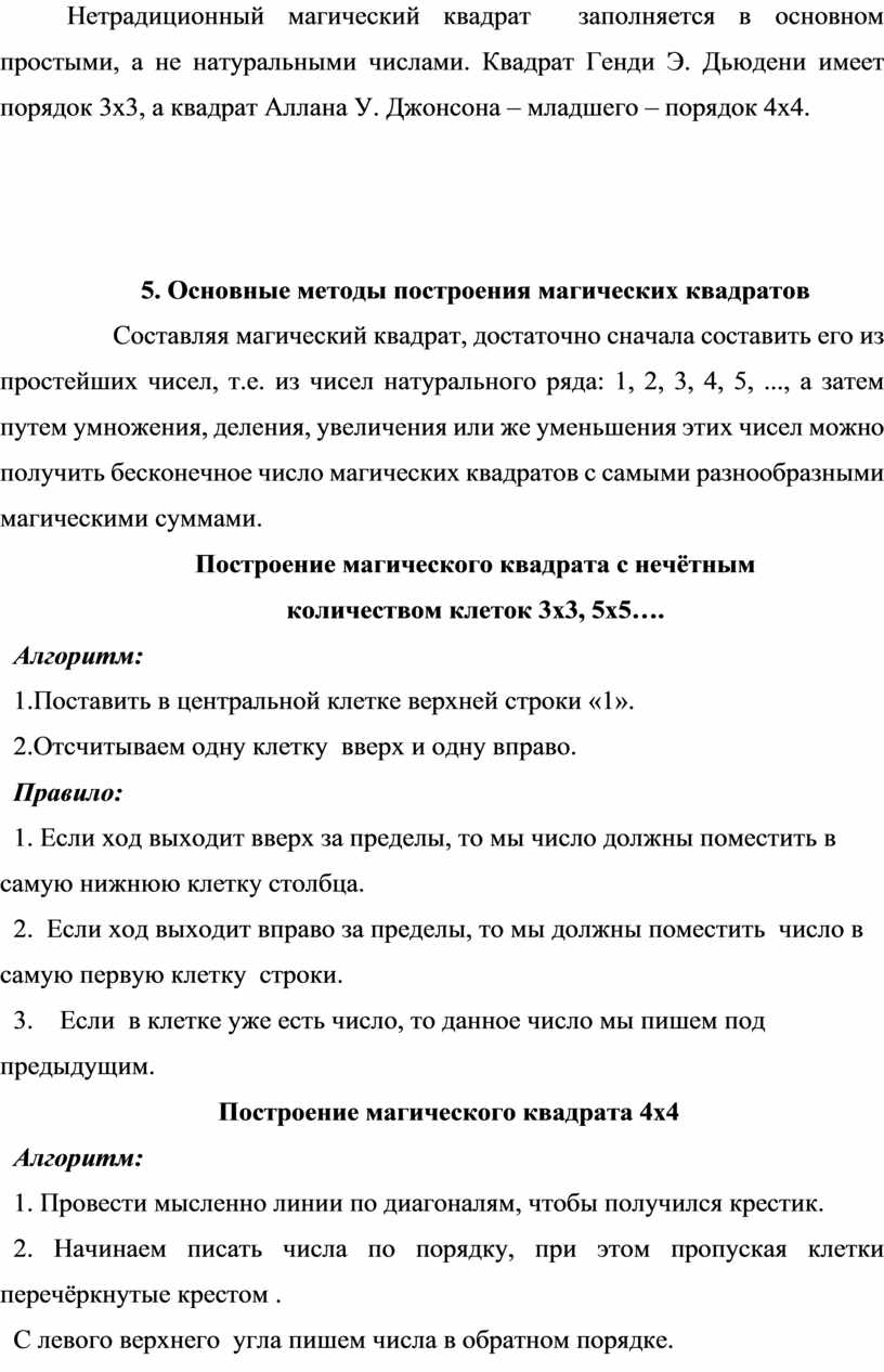 Нетрадиционный магический квадрат заполняется в основном простыми, а не натуральными числами. Квадрат Генди Э. Дьюдени имеет порядок 3х3, а квадрат Аллана У. Джонсона – младшего – порядок 4х4.