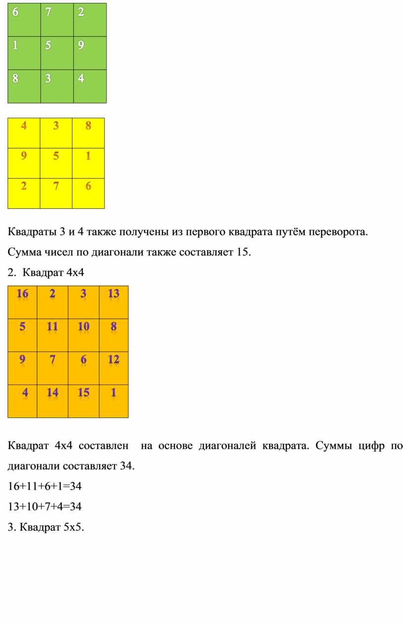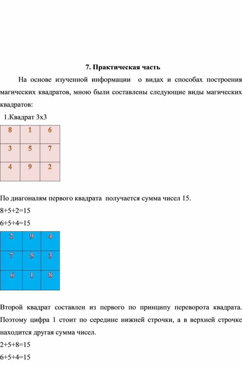 На основе изученной информации о видах и способах построения магических квадратов, мною были составлены следующие виды магических квадратов: