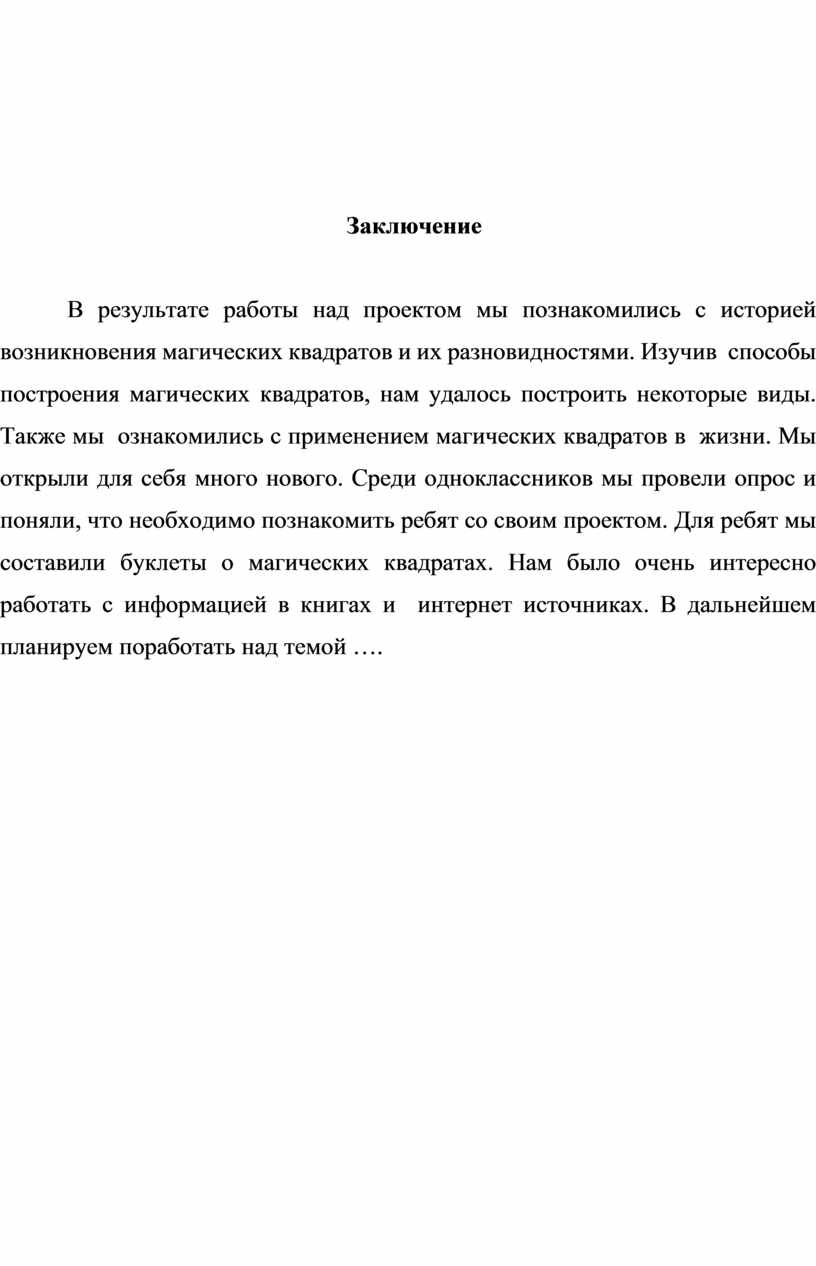 В результате работы над проектом мы познакомились с историей возникновения магических квадратов и их разновидностями. Изучив способы построения магических квадратов, нам удалось построить некоторые виды. Также мы ознакомились с применением магических квадратов в жизни. Мы открыли для себя много нового. Среди одноклассников мы провели опрос и поняли, что необходимо познакомить ребят со своим проектом. Для ребят мы составили буклеты о магических квадратах. Нам было очень интересно работать с информацией в книгах и интернет источниках. В дальнейшем планируем поработать над темой ….