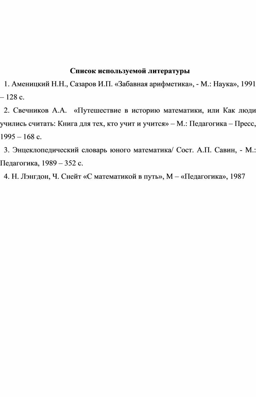 1. Аменицкий Н.Н., Сазаров И.П. «Забавная арифметика», - М.: Наука», 1991 – 128 с.